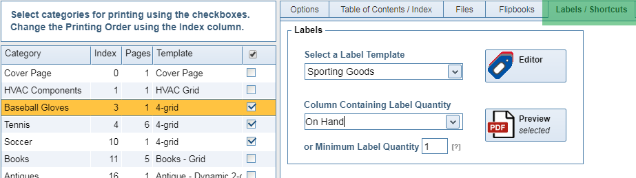 Optionally, you can print a preset number of labels for any selected products regardless of inventory levels.