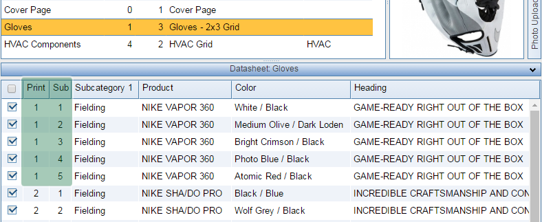 Here's how that data is recorded in the Datasheet. In this example, there are five related records which form a Product Group. The Print Order and Sub Order columns are highlighted to show how CleverCat creates a Data Table. Each item in the Product Group shares a common Print Order number and the Sub Order number sets the printing order within the Group. |