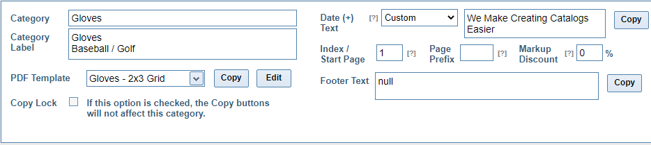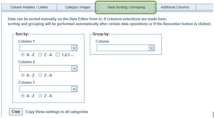 This form is a duplicate of the Data Sorting / Grouping form on the Data Editor. It's purpose here is so that you can use the Copy button to apply the same settings to all categories. |