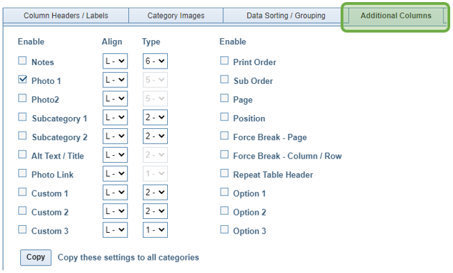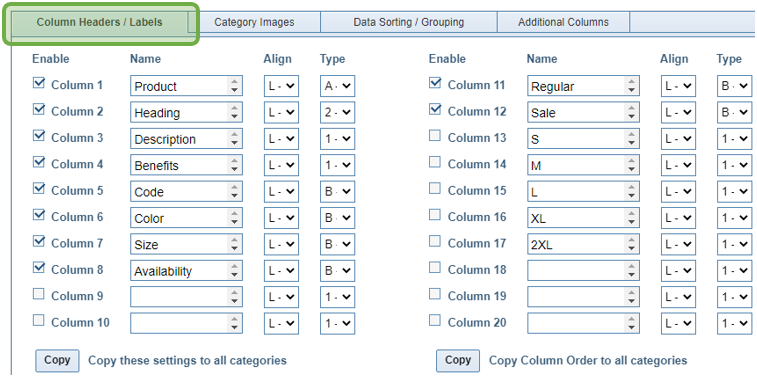 If you imported your product data from a CSV file, the Column Headers may already be set. You could also have entered them on the Data Editor form, if they were blank. There are two stacks of four columns: Enable, Name, Align, and Type.