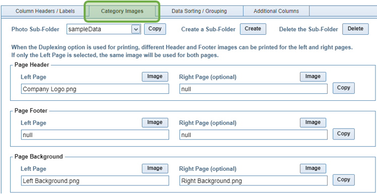 There are three spots on a printed page where you can add an image: Header, Footer, and Background. Note that there are settings for both Left and Right page. You can use this feature when printing a center-bound catalog to create an image that seems to span both pages. If an image is chosen only for the Left page, that same image appears on the right.