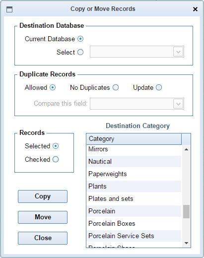 Copy makes a copy of the selected records in the Destination Database / Category. Move does not make a copy of the records, it only relocates them to the Destination Category.