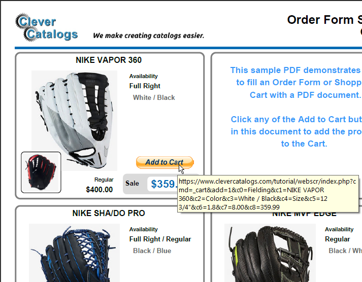 Here's the actual link text from this example: https://www.clevercatalogs.com/tutorial/webscr/index.php?cmd=_cart&add=1&c0=Fielding&c1=NIKE%20VAPOR%20360&c2=Color&c3=White%20/%20Black&c4=Size&c5=12%203/4%22&c6=1.8&c7=8.00&c8=359.99 Broken down, this link sends the following data: