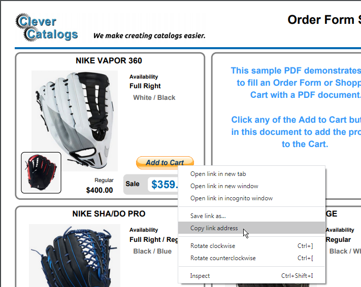 Previous tutorials demonstrated how to create PayPal Shopping Cart buttons on a PDF. But it's also possible to create buttons that work with a Custom Cart. Many of the PDF functions described here are part of CleverCat Online and included with your subscription. The Cart Features are pages to be created on your existing website. You can have these page designed by your own web designer, or we can create them for you Contact us for pricing information. For the purpose of this tutorial, open this sample PDF as it will be used as an example. |