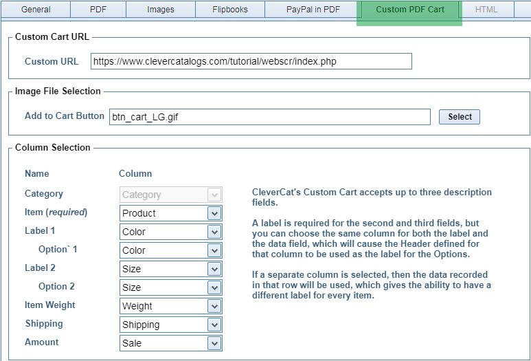 cmd= _cart Note that the transmitted data can include information which was not printed, such as the product's weight and shipping cost. The Custom URL and the column data to be transmitted can be set on the Configuration form at the bottom of the Custom PDF Cart tab. |