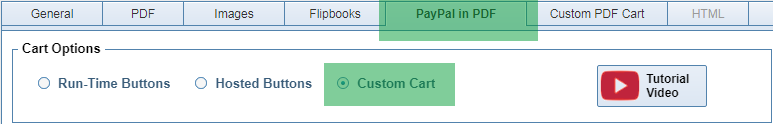 Setting up the Custom Buttons is simple. Open the Configuration form and select Custom Cart on the PayPal in PDF tab. This enables the Custom PDF Cart tab. |