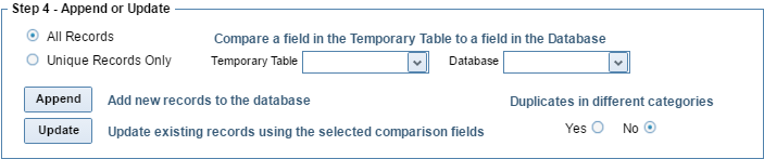 If your updated spreadsheet contains both new rows and edited rows, you will want to perform the updata process twice, first using the Append button and then using the Update button. The Update function can also be used to add a new column to the database. First, in the compare options, select the new column that you want to insert for the Temporary Table option, and then select an empty column for the Database option. |