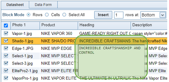 The Datasheet is a grid of cells very similar to a Spreadsheet. To edit a cell, simply double-click it. A different Editing Field will open, depending on the cell type. |