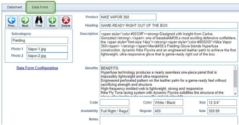 There is an optional Data Form for those who prefer to view their products one at a time. The Data Form can be configured on the Category Editor. View the Data Form Configuration Tutorial for more information. |