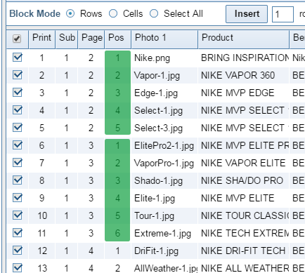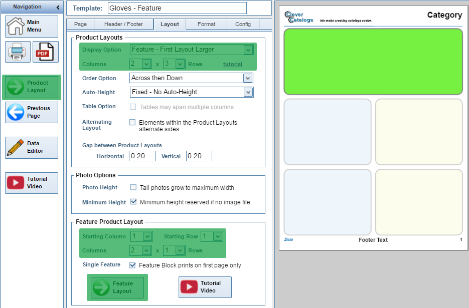of the catalog. Because the option to have the Feature on the first page only has been used, the second highlighted block indicates 6 rows on Page 3.