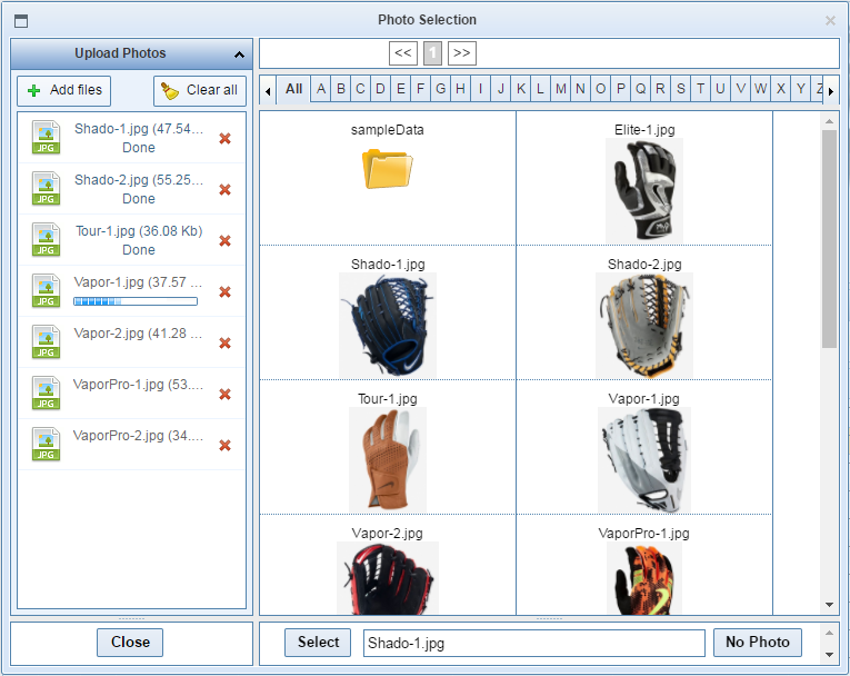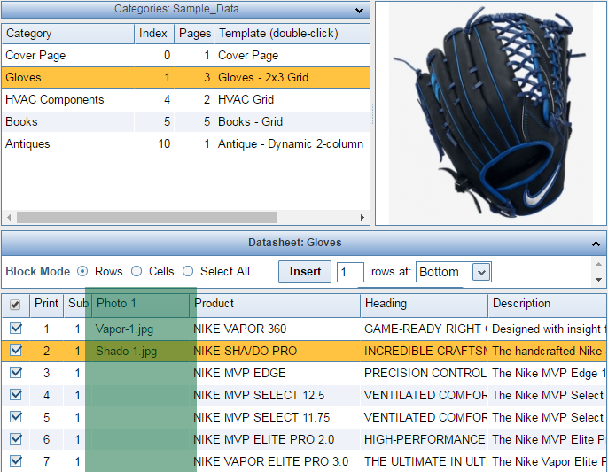 To assign an image, either double-click the thumbnail in the Preview Grid, or select it and then click Select at the bottom of the window. The name of the image file should now be displayed in the cell in the Photo Column and a preview of the image should be shown in the upper-right corner of the Data Editor form. NOTE: If you have a large number of images and know the name of the image file, you can just type it into the Select box at the bottom of the Photo Selector and click the Select button, to avoid having to search through the thumbnails. The No Photo button removes the image from the currently selected row of the Datasheet, but does not delete the photo. If you want to delete stored photos, click to highlight them in the Preview Grid and click the Delete Selected button. You can delete multiple photos at once by holding down the Shift of Control key on your keyboard while clicking photos in the grid. |