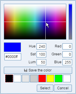 To save a color to the palette for easier selection, click one of the eight color boxes at the bottom of the selection tool before selecting a color. Then click the Save the Color button to save the color in the selected box. |