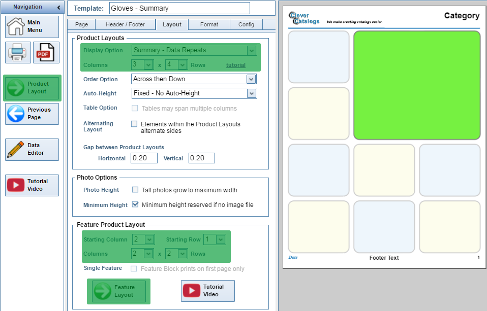 To design the actual layout for the Feature block, click the Feature Layout button. To design the Standard Layouts, click the Product Layout button as you would for any Grid template.